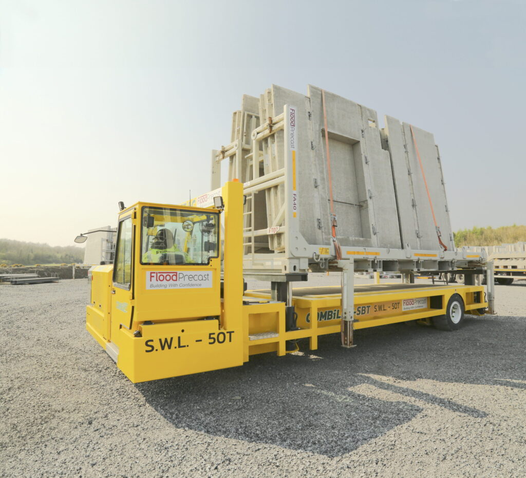 The COMBI-SBT is a diesel-powered shuttle vehicle designed to transport 50-ton pre-staged concrete loads on swap bodies within a yard or between a manufacturing facility and storage. Featuring a 3-wheel design with hydrostatically driven rear wheels, the Combi-SBT offers excellent maneuverability and visibility. The front steering and off-center cab position allow even novice operators to easily position the machine, ensuring precise load handling