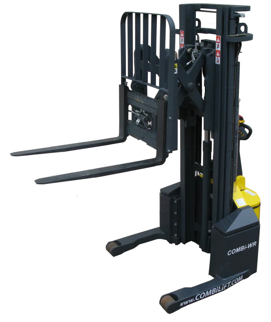 The Combi-WR is the first purpose built pedestrian reach stacker with the ability to operate in a VNA aisle of just 2.1m and with a lift capacity of 3,200 lb. Its excellent ergonomics make it easy and stress free to operate. The patented multi-position tiller arm enables push button rotation of the rear wheel parallel to the chassis and back, improving forward visibility and greatly reducing the risk of incidents in tight confines.